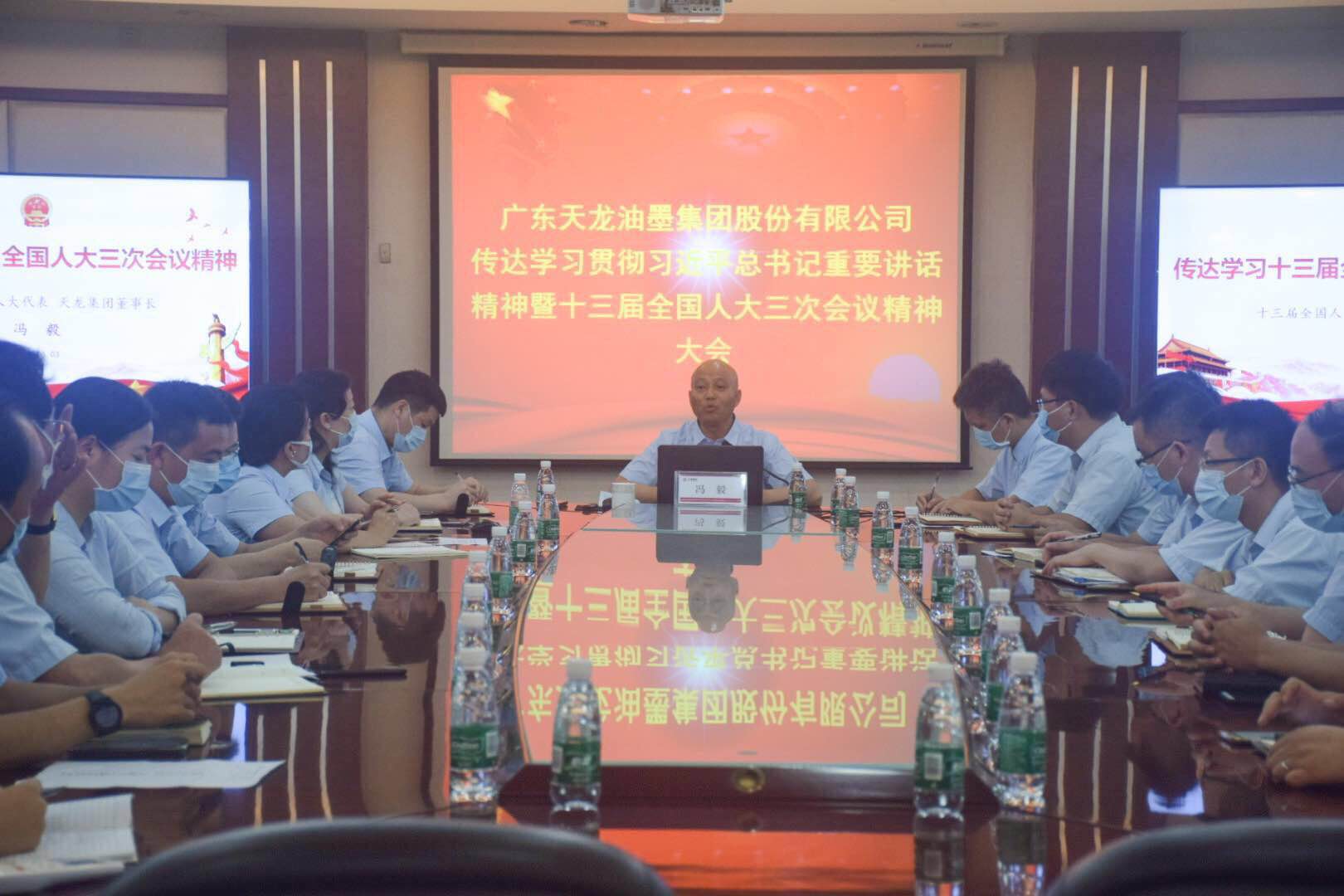 2020年6月3日下午,天龙油墨集团传达贯彻习近平总书记重要讲话精神暨十三届全国人大三次会议精神大会在集团总部四楼会议室召开。刚于5月底在京完成各项履职任务归来的全国人大代表、天龙油墨集团董事长冯毅,向与会人员传达习近平总书记重要讲话精神暨全国两会精神并做工作部署。天龙集团本部全体员工、子公司广东天龙中层以上管理人员参加会议。